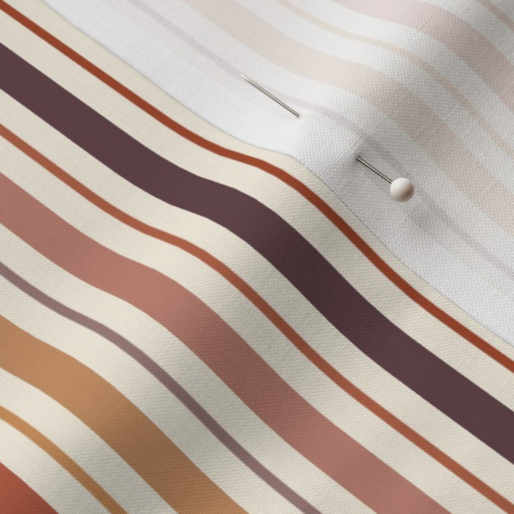 A small-scale vertical ticking stripe in soft cream with alternating lines of burnt terracotta, clay orange, toffee tan, and muted plum. Ideal for aprons, tea towels, quilt blocks, and cozy kitchen or dining accents.
