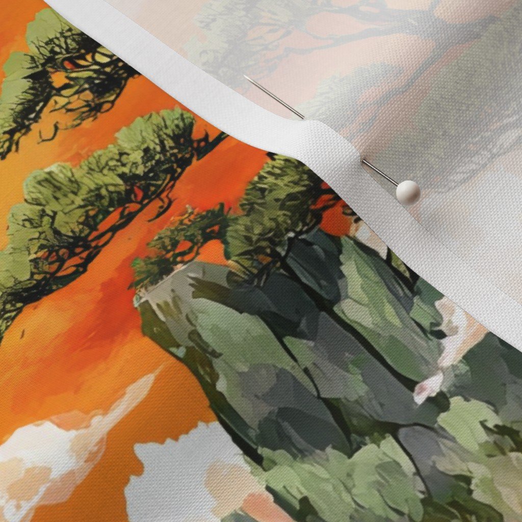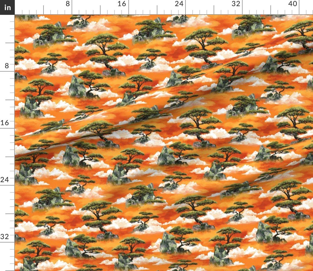 Small-scale watercolor pattern featuring Japanese bonsai pine trees, rocky mountains, and drifting clouds. The tighter repeat keeps the bold orange sky and painterly details balanced, making it ideal for quilting, apparel, accessories, and detailed sewing