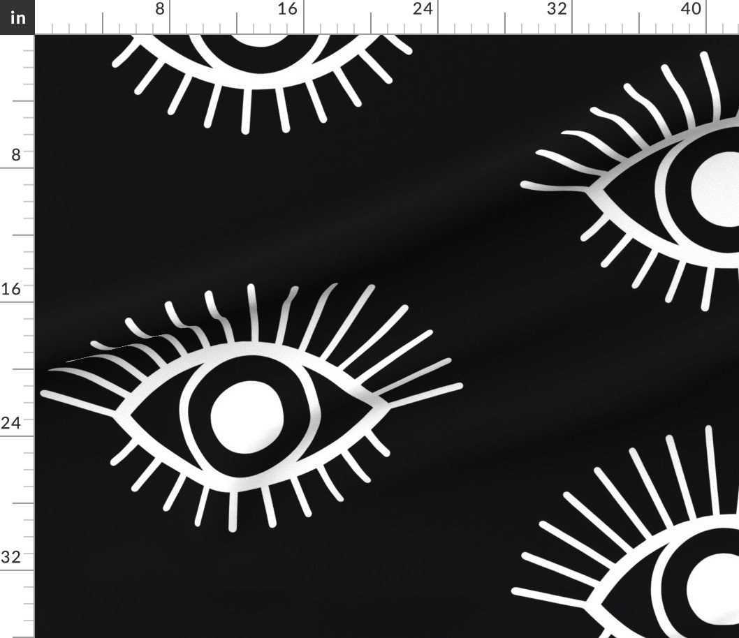 A wide-spaced repeat of mystical eye symbols in crisp black and white for a modern sacred look.