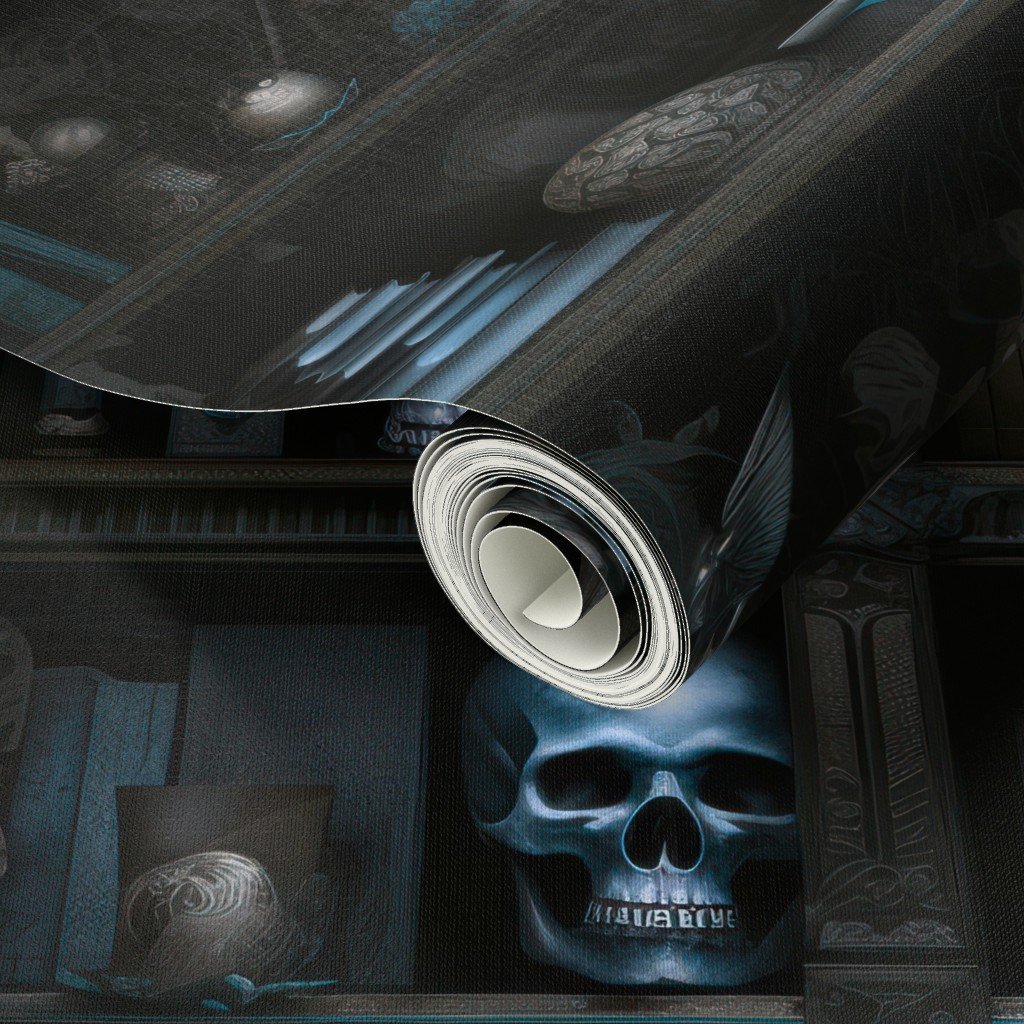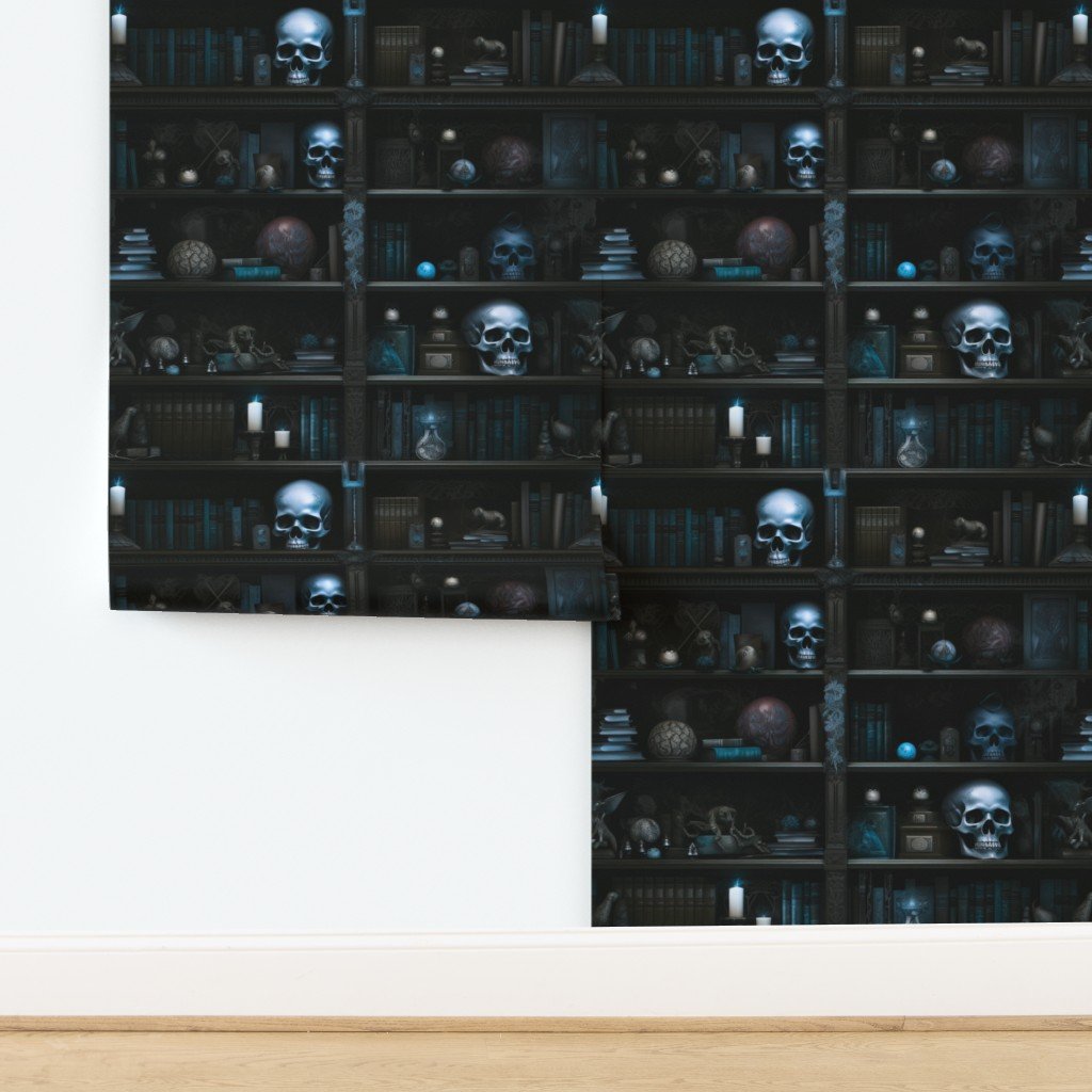Photo-realistic books in muted blue tones in a dark academia library at Halloween with glowing skulls