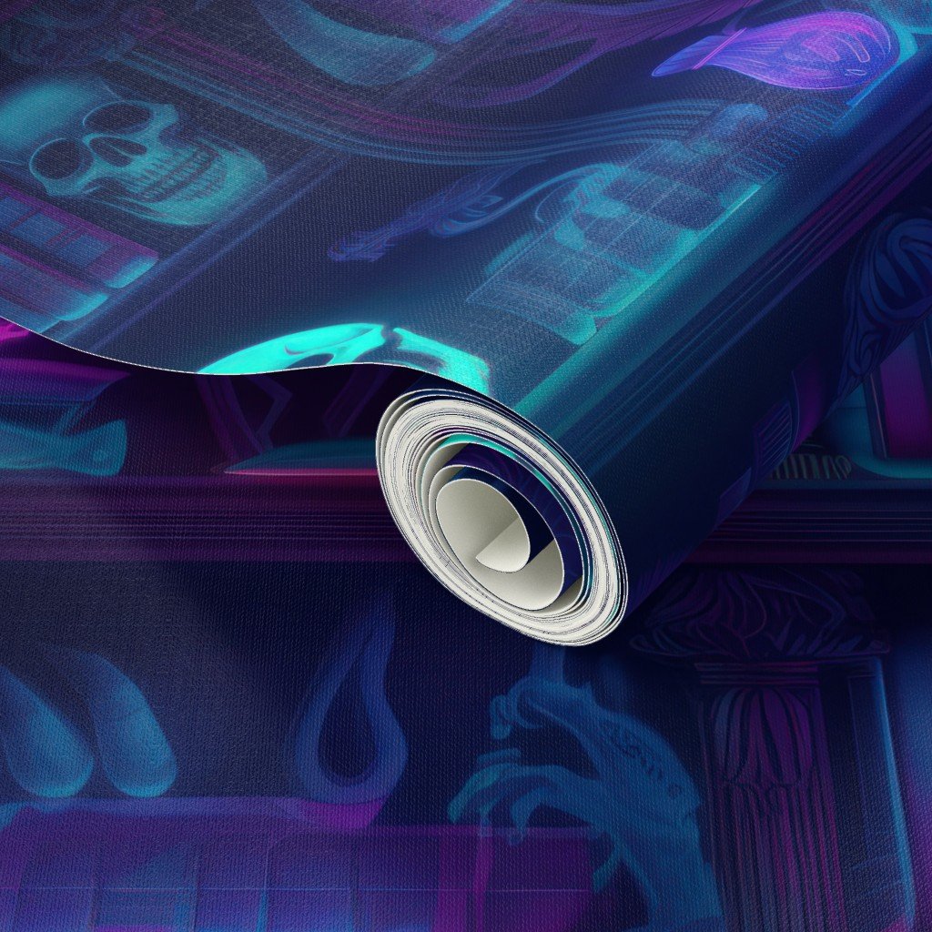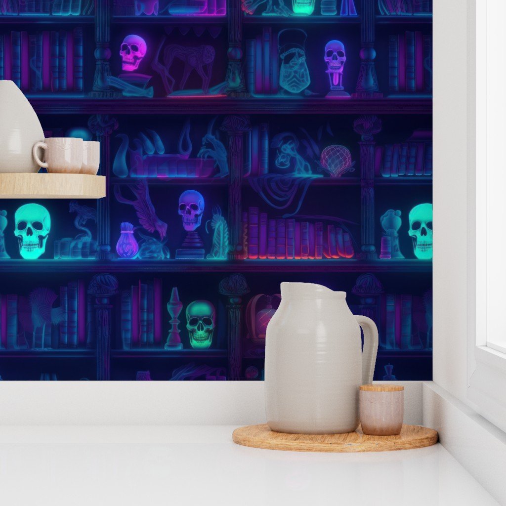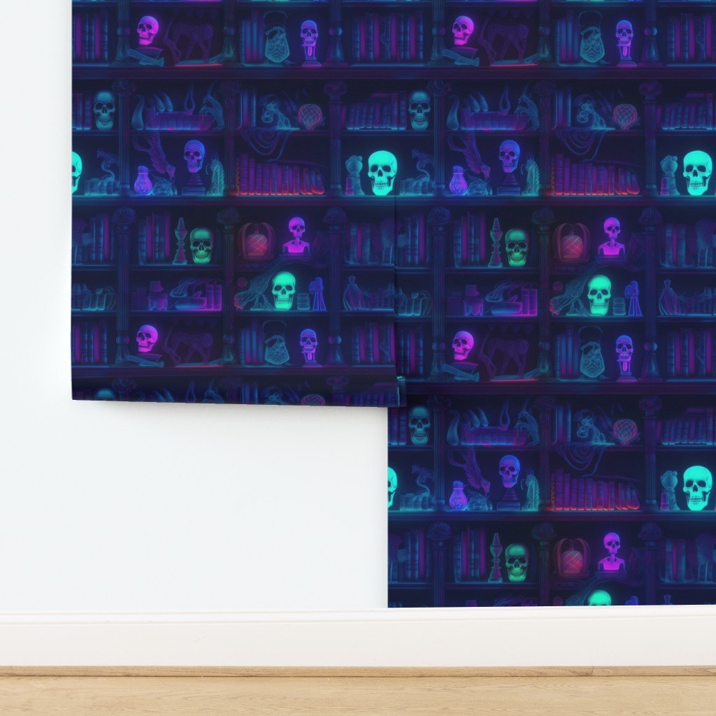 Photo-realistic books in bright blue neons in a dark academia library at Halloween with glowing skulls