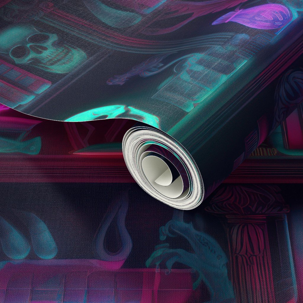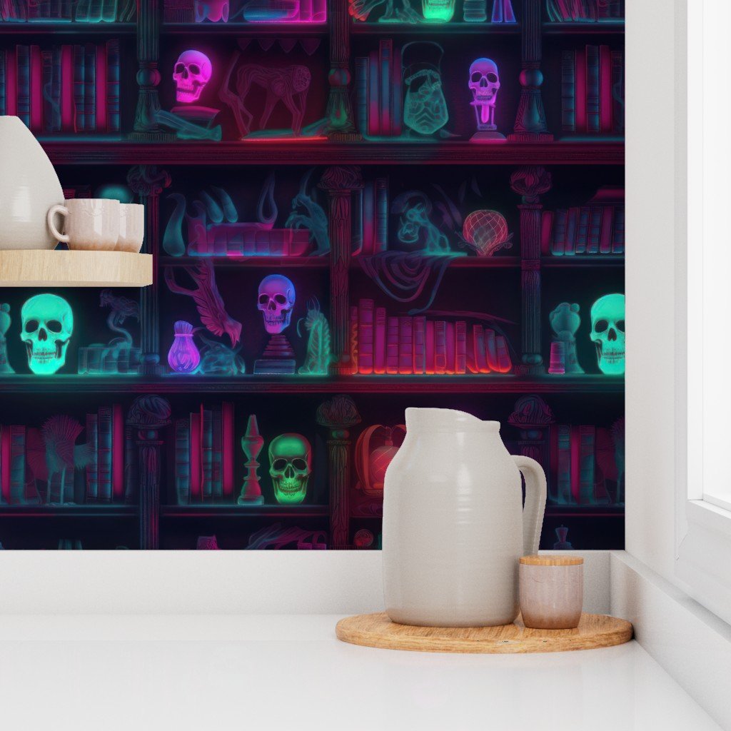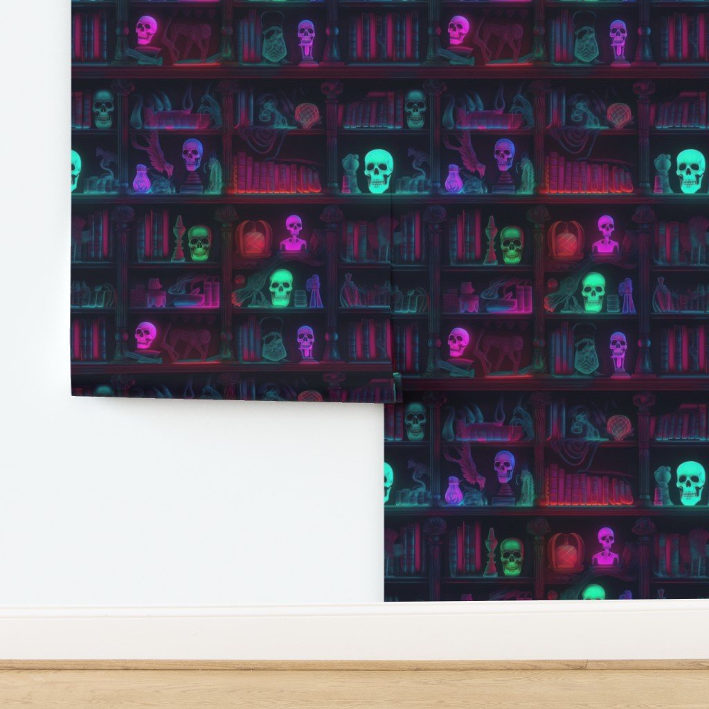Photo-realistic books in bright red neons in a dark academia library at Halloween with glowing skulls