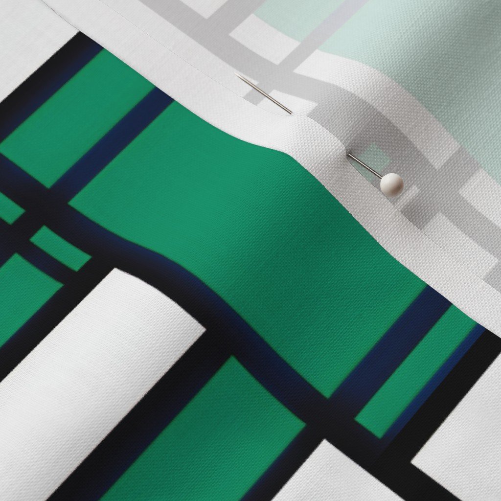 Teal green blocks pop against crisp black lines and white gaps in this bold geometric grid pattern inspired by modern urban layouts.