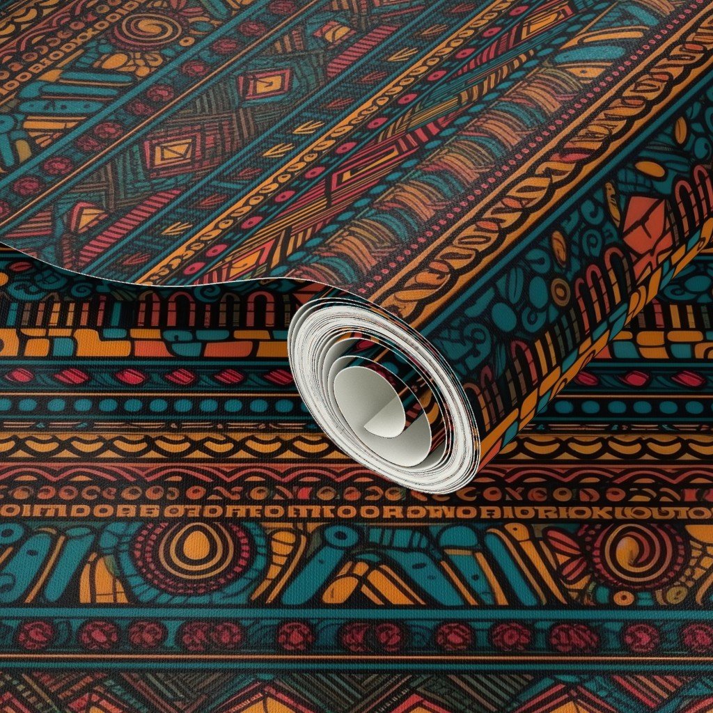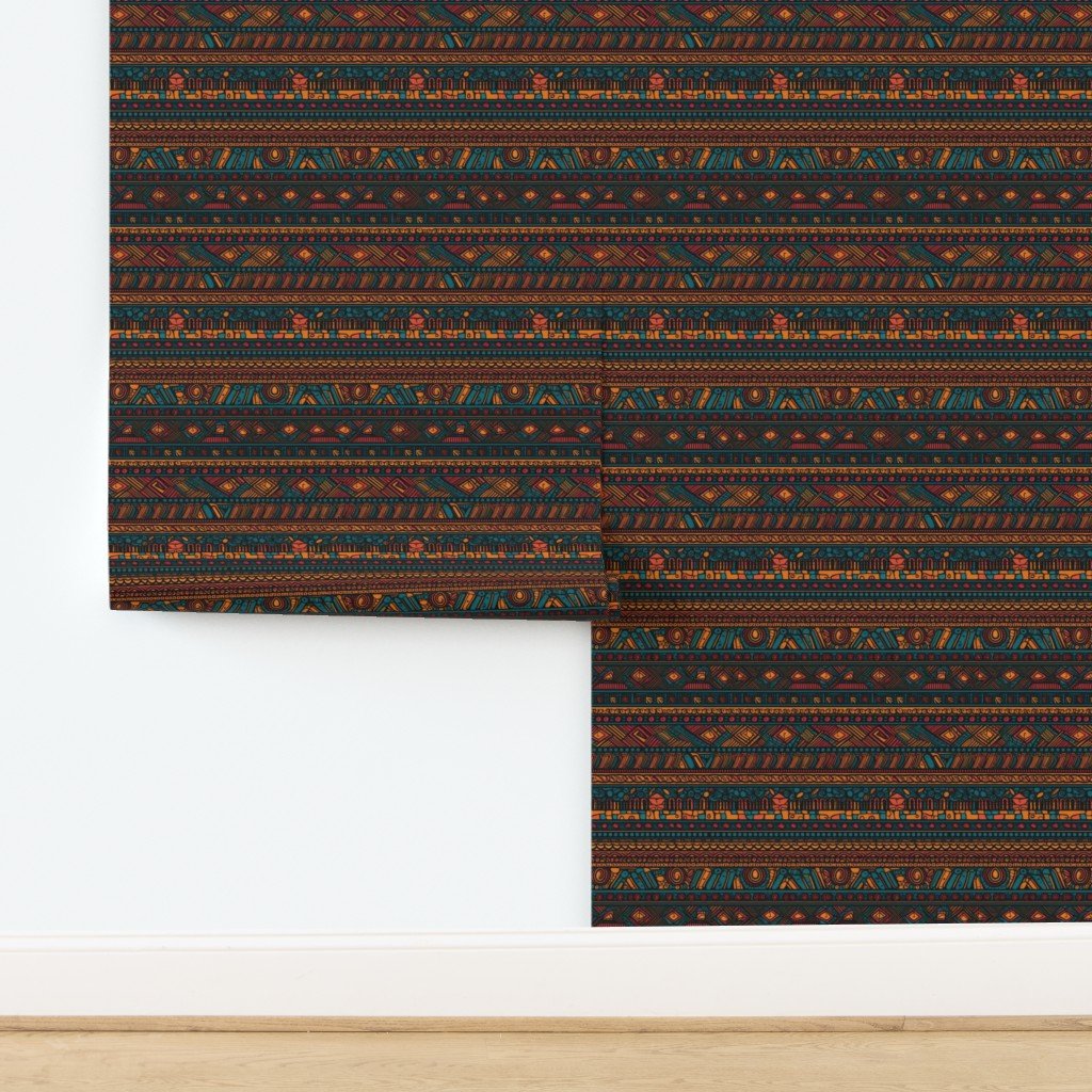 Earthy teal and brown mudcloth tribal print with burgundy and orange geometric motifs