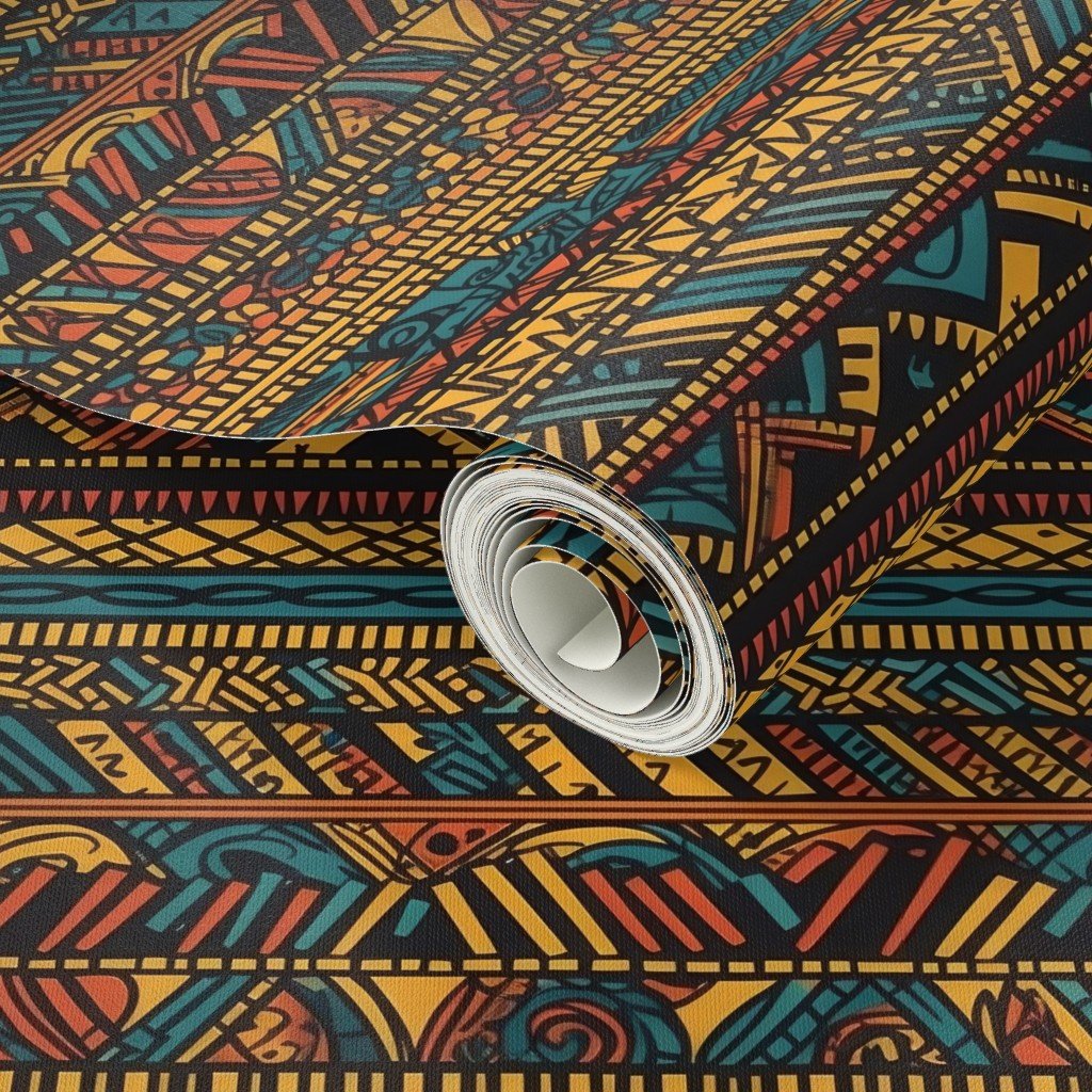 Earthy teal and gold mudcloth tribal print with brown and orange geometric motifs