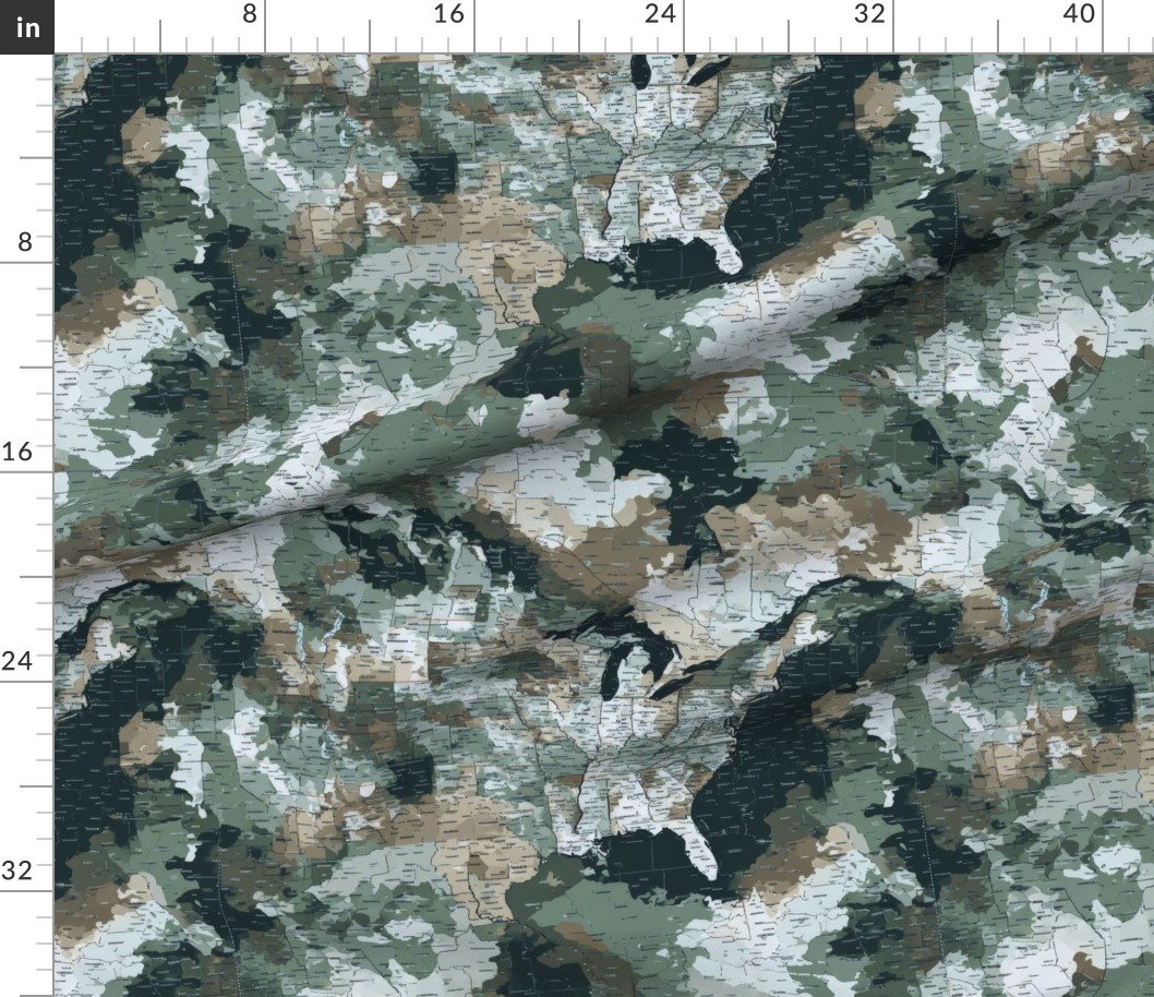 A repeating pattern of U.S. state outlines filled with cool sage green, slate, off-white, and muted woodland camouflage tones. A modern earth tone map design blending American geography with classic camo styling.