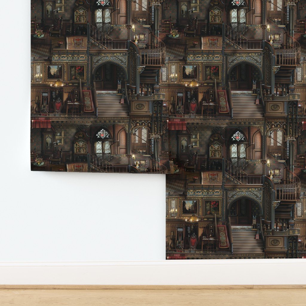 Dollshouse decorated in typical nineteenth century Victorian Dark Academia style with dark tone curtains, festoons, tassels and ornate furnishings