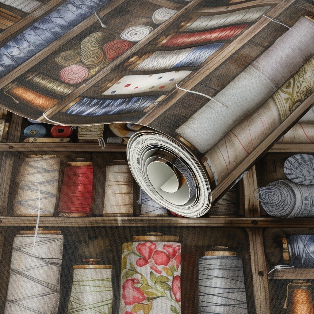 This charming pattern showcases a vintage bookcase filled with an assortment of fabric bobbins, spools, and yarns.