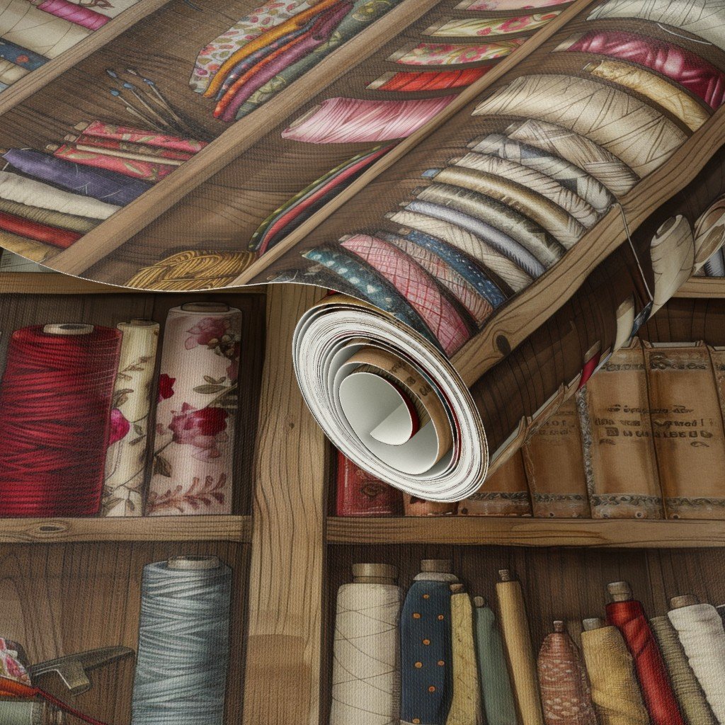 This charming pattern showcases a vintage bookcase filled with a delightful assortment of fabric bobbins, spools, and yarns.