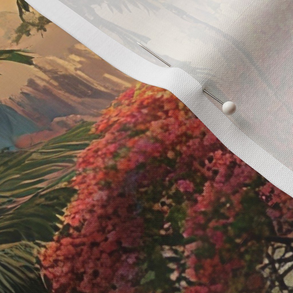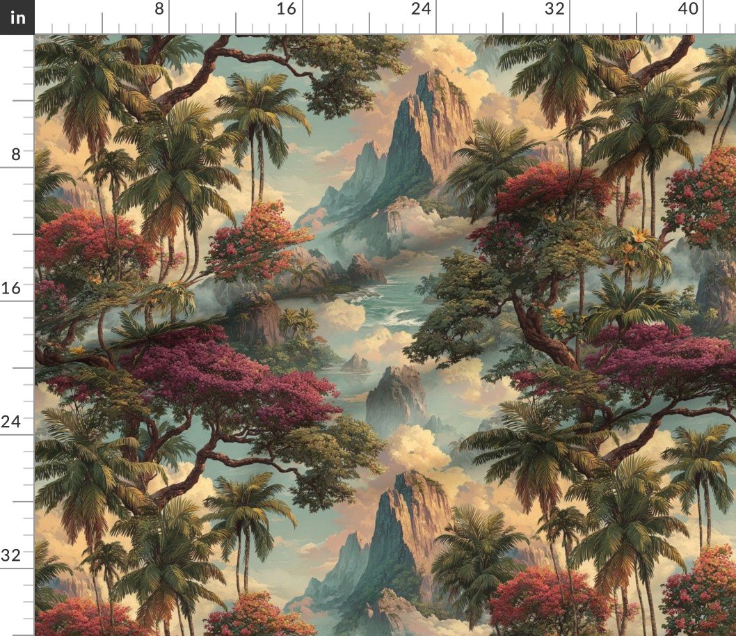A lush Hawaiian watercolor scene filled with towering misty mountains, palm groves, and vibrant tropical blooms in magenta and gold. Rolling clouds drift over the peaks while the ocean sparkles beyond, evoking a timeless island paradise.