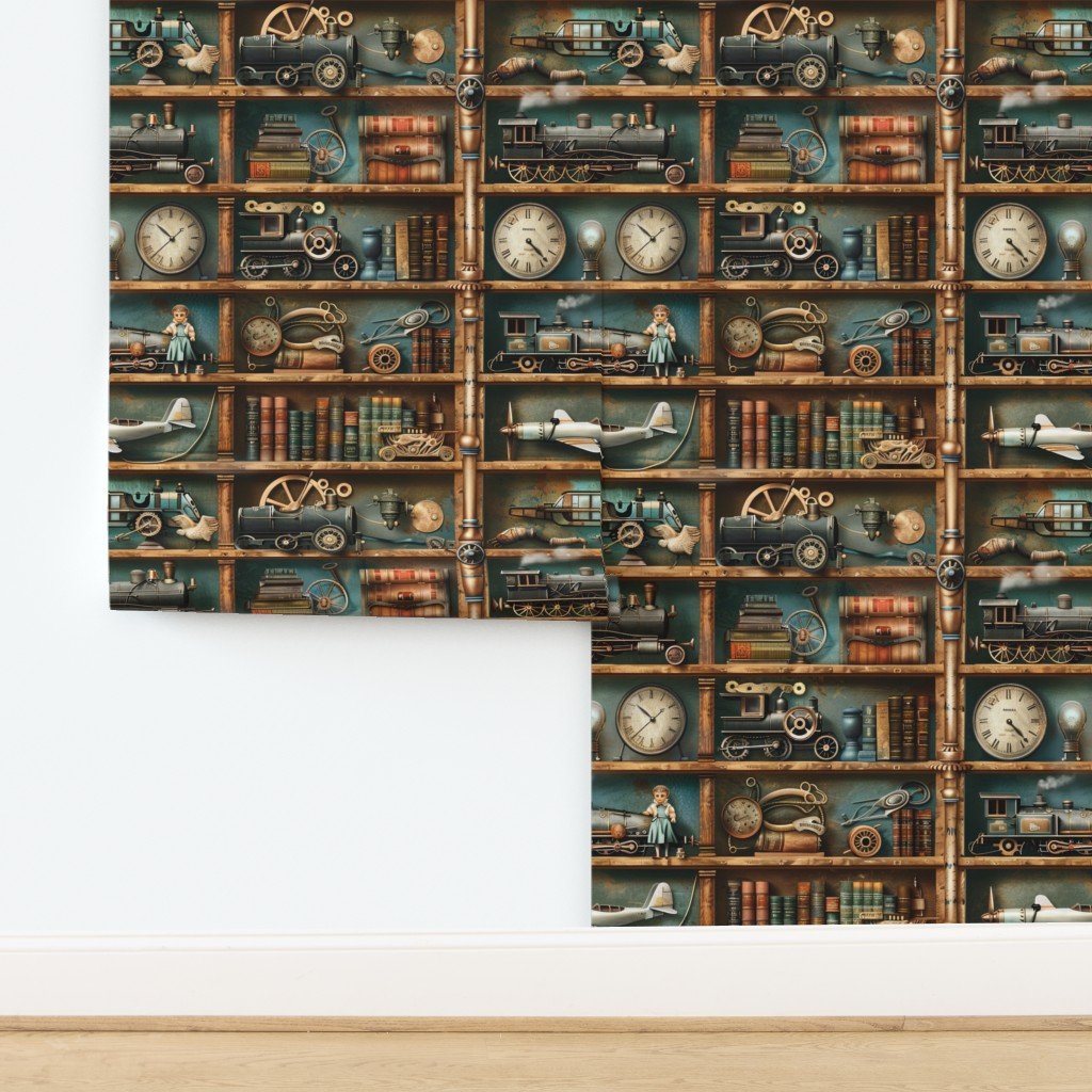 This intricate pattern features a vintage steampunk bookcase filled with an eclectic mix of gears, clocks, trains, books, and other mechanical wonders