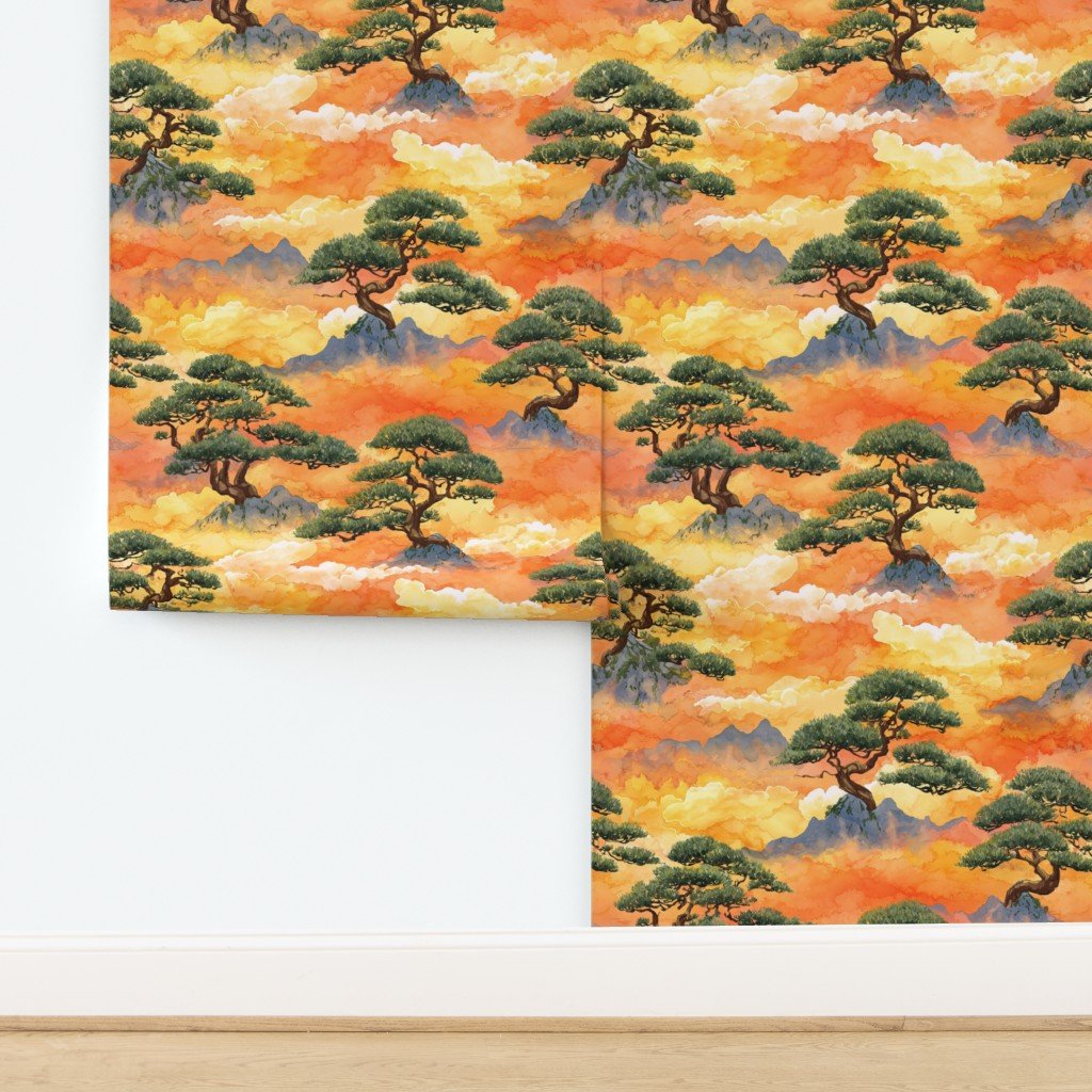 A flowing watercolor pattern inspired by Japanese landscape art, featuring sculpted bonsai pine trees rising from rocky peaks and drifting through layers of glowing clouds. Warm tones of gold, amber, and soft orange blend with muted mountain blues
