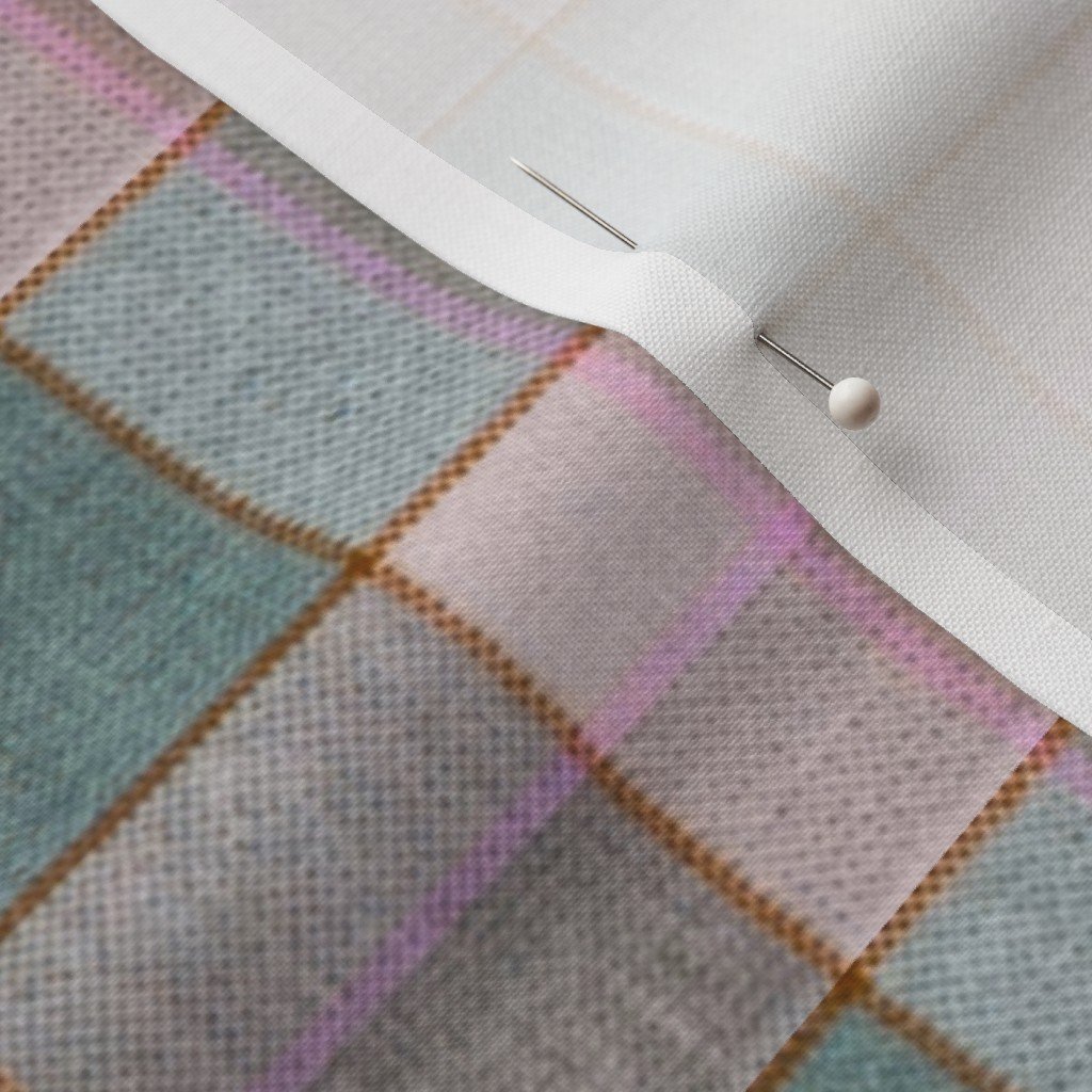 A Christmas-themed weathered wool tartan in frosty blue and pink, accented by olive green and beige. Perfect for cozy holiday decor or winter fashion.