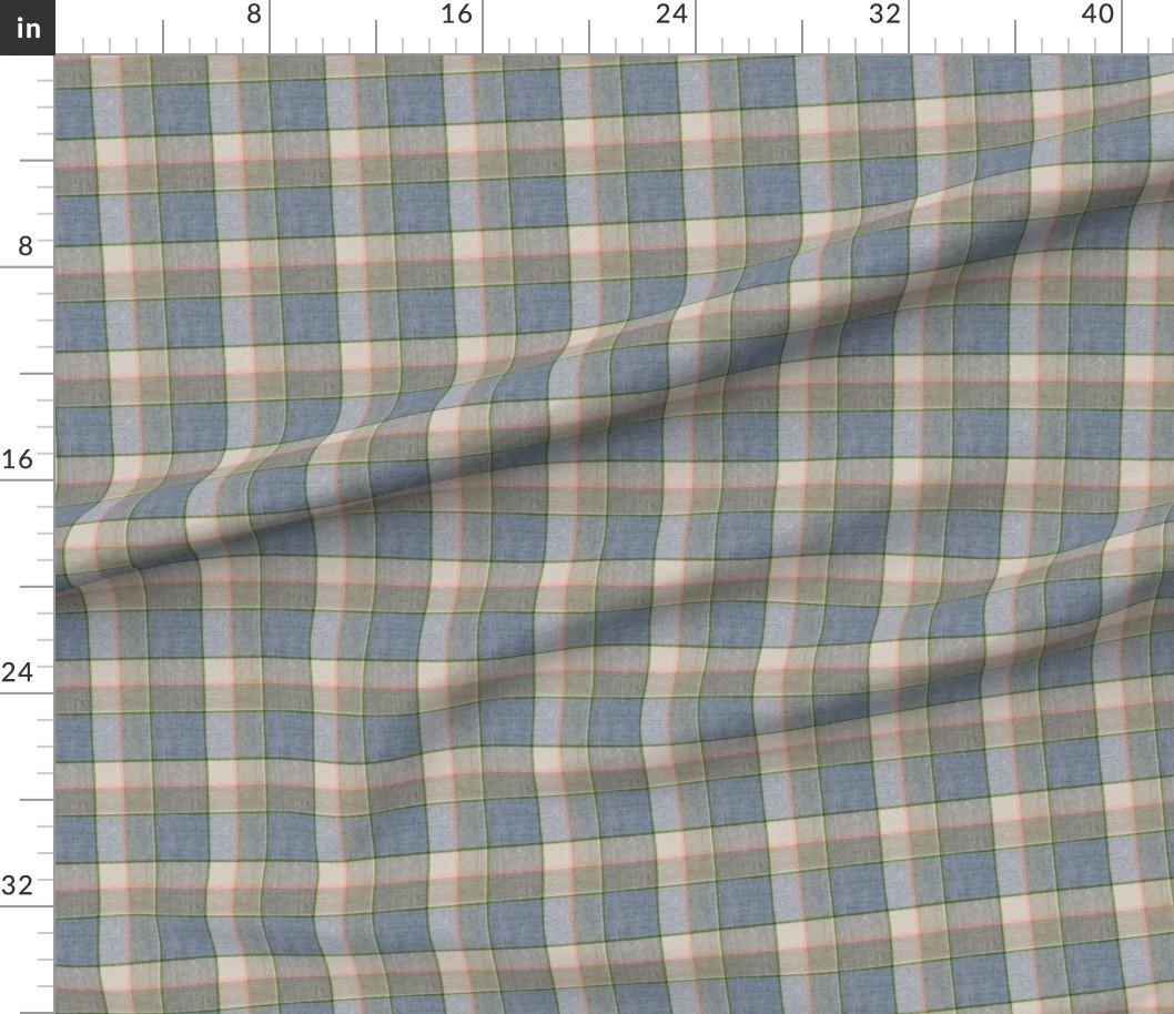 A Christmas-themed weathered wool tartan in frosty blue and soft beige, highlighted by green and peach lines. Perfect for festive decor or cozy holida
