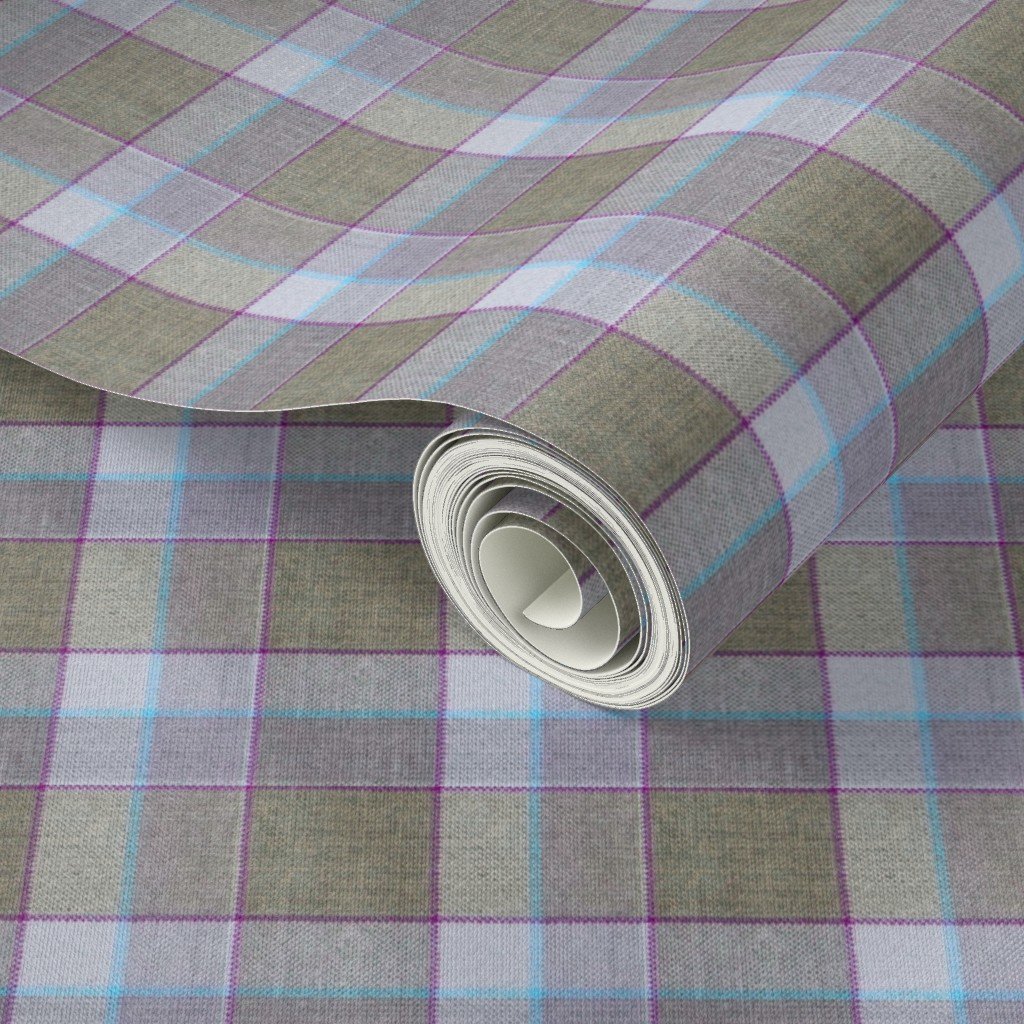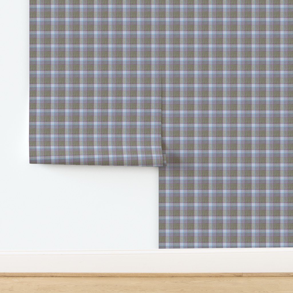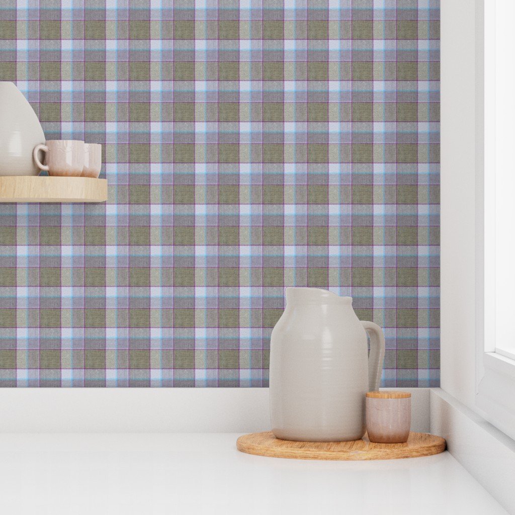 A Christmas-themed weathered wool tartan in olive green and light blue, accented with soft lavender and teal lines. Ideal for cozy decor or festive ho