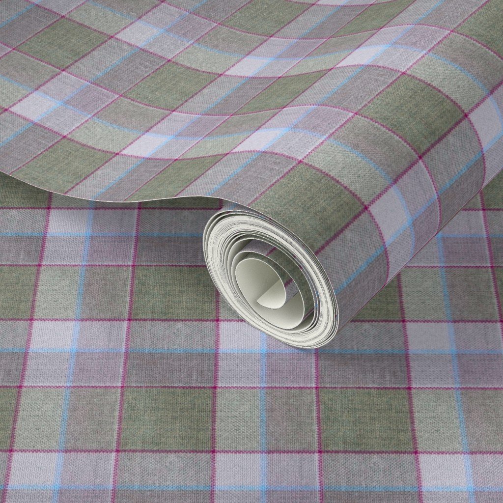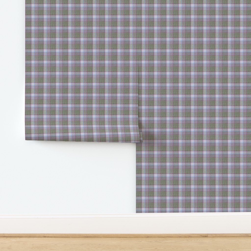 A Christmas-themed weathered wool tartan in olive green and soft lavender, accented with light blue and red lines. Ideal for festive decor or cozy win