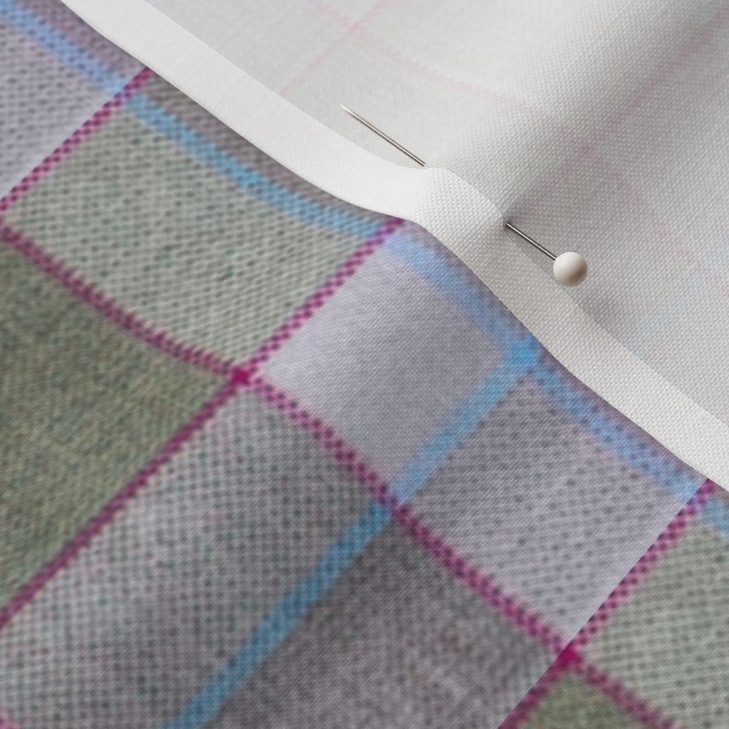 A Christmas-themed weathered wool tartan in olive green and soft lavender, accented with light blue and red lines. Ideal for festive decor or cozy win