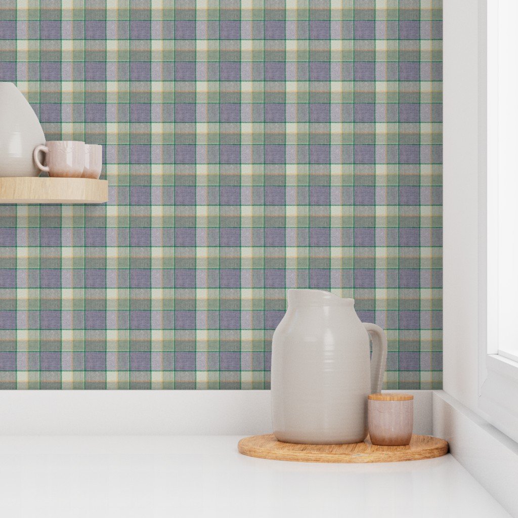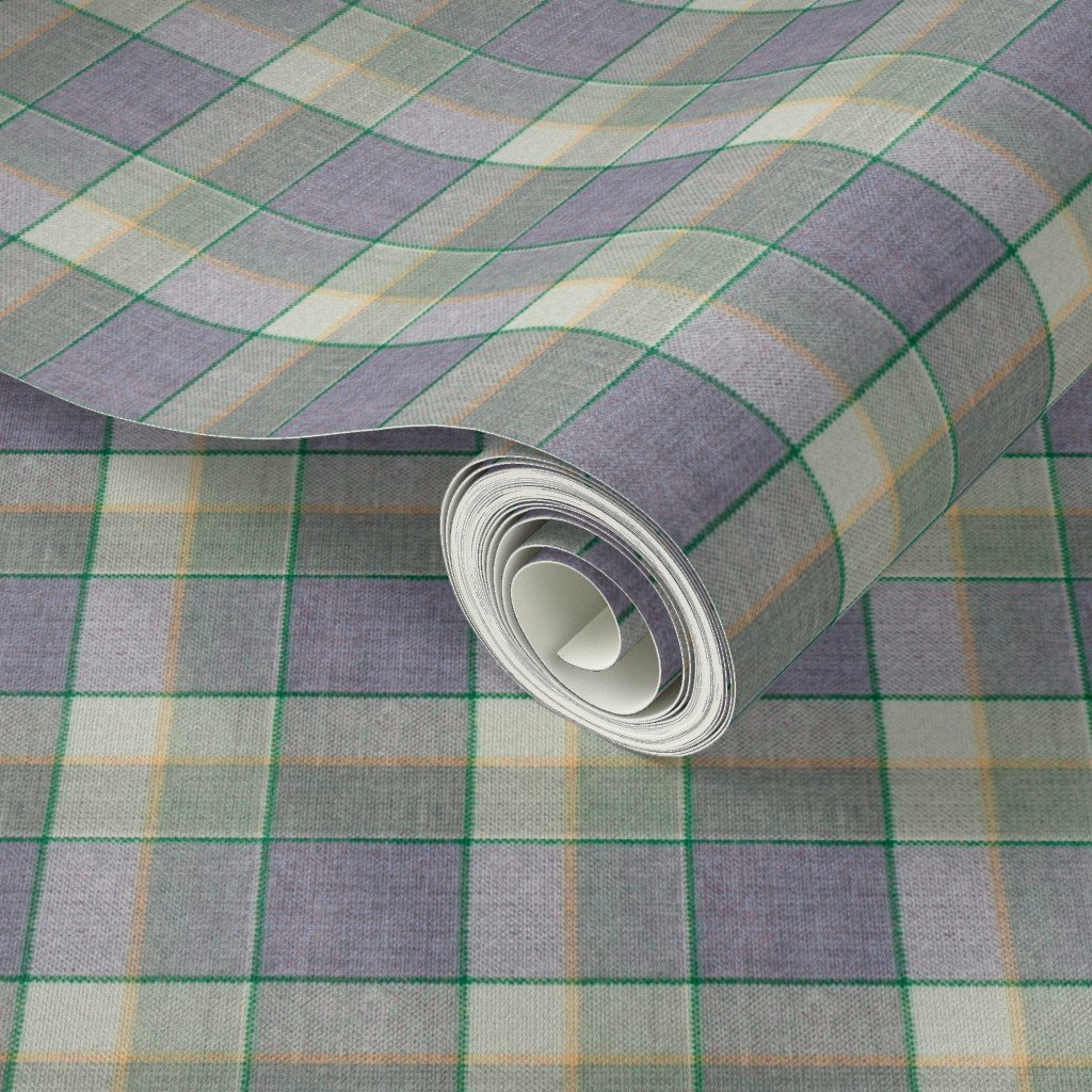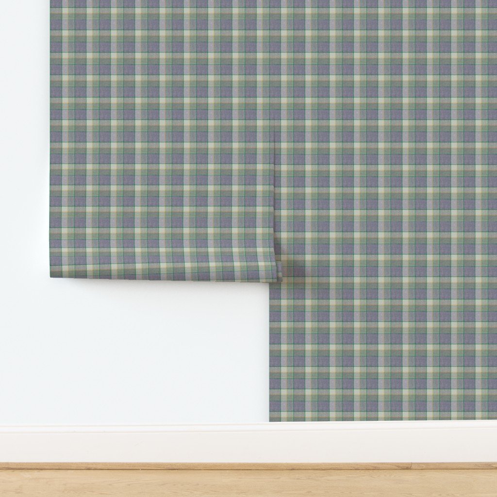 A Christmas-themed weathered wool tartan in sage green and soft blue, accented with light peach and yellow. Perfect for cozy holiday decor or winter f