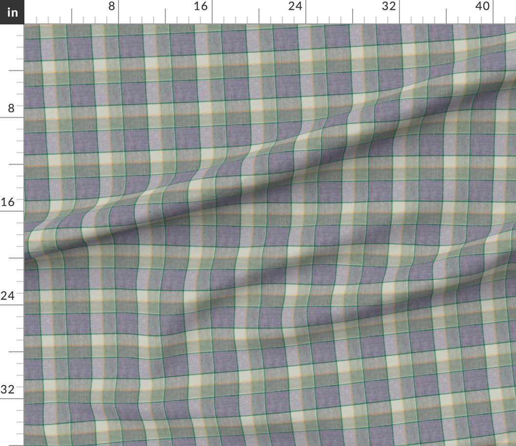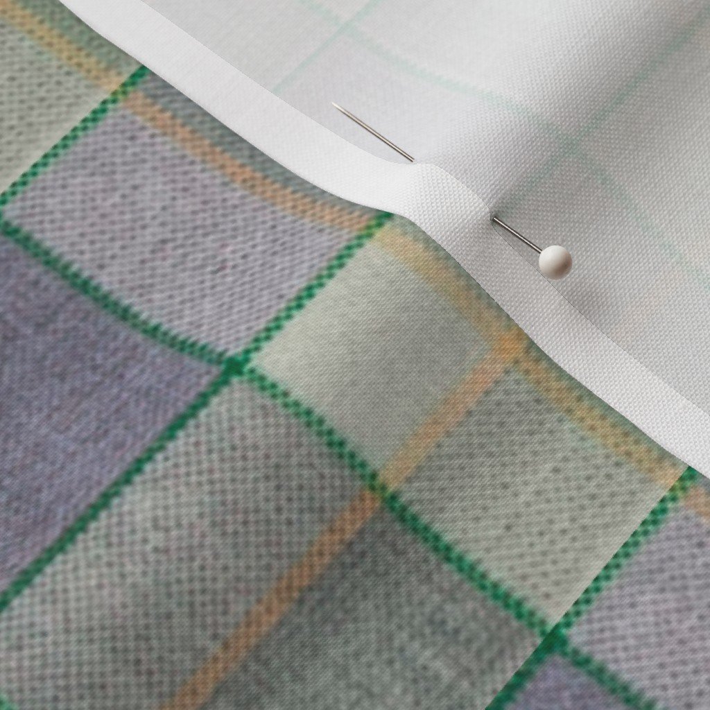 A Christmas-themed weathered wool tartan in sage green and soft blue, accented with light peach and yellow. Perfect for cozy holiday decor or winter f