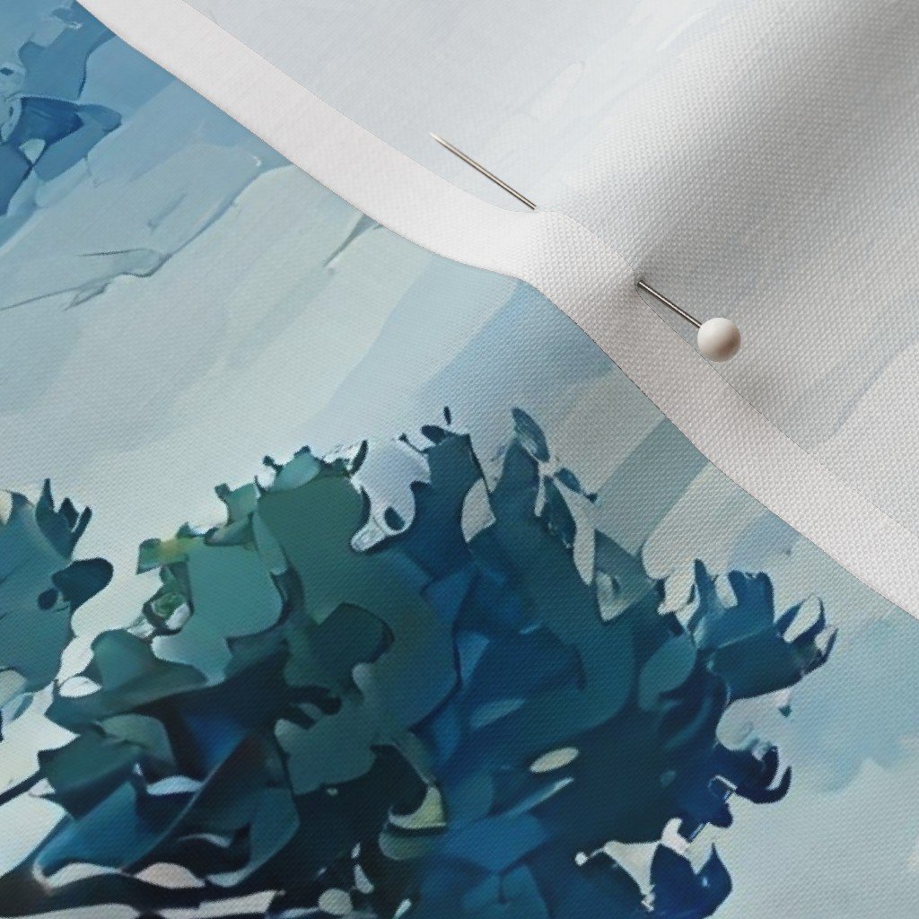 A festive winter watercolor of Yellowstone National Park with a snow-covered pine standing next to a steaming hot spring. Cool blues and whites mix with holiday red and green for Christmas charm.